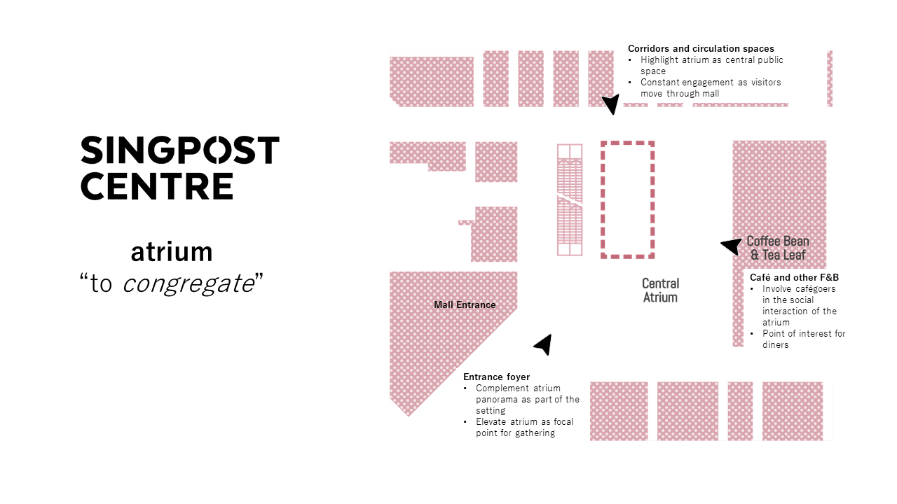 Seeking to uplift the atrium of SingPost Centre, π΅β€οΈπ brings office workers, shoppers, and diners together at a nexus of gathering and social interaction. As a public space at the focal point of the development, the design creates a βcity living roomβ for socialising on a public level. And socialisation occurs beyond the boundaries of the site, as visitors from the adjacent cafes, eateries, and retail outlets are invited to participate in the congregation.